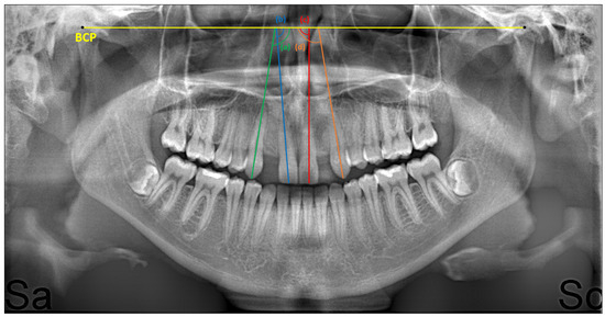 In the literature, it has been reported that panoramic radiographs can be used in the evaluation of root inclination and parallelism and in the evaluation of axial angulations with a reference plane, and that they have advantages such as causing less radiation and being inexpensive [27,32,33]. Therefore, in this study, the mesiodistal angulations of the maxillary canine and central incisors were measured according to the bicondylar reference line on panoramic radiographs.