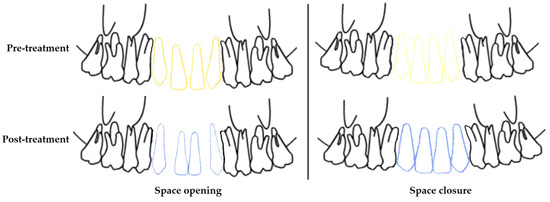 Fixed orthodontic treatments were carried out using stainless steel metal brackets with a 0.022 × 0.028 inch slot MBTTM prescription (Mini Master, American Orthodontics, Sheboygan, WI, USA) [29]. During the sessions, round 0.014 inch heat-activated nickel-titanium (HANT), 0.016 inch HANT, and 0.016 inch stainless steel arch wires were applied to the patients, followed by rectangular 0.019 × 0.025 inch HANT, and rectangular 0.019 × 0.025 stainless steel arch wires (American Orthodontics, USA). In the space opening group, after 1 session of applying rectangular 0.019 × 0.025 stainless steel arch wire, open coil springs were placed and activated and space opening was applied. Orthodontic treatment was completed after the space obtained for prosthetic rehabilitation of the maxillary lateral incisor was approved by prosthodontist and surgeon consultation. In the space closure group, a 0.019 × 0.025 stainless rectangular arch wire with hook (Brass posted, American Orthodontics, USA) was placed following the 0.019 × 0.025 HANT (American Orthodontics) arch wire and we waited for 1 session. Then, a 1.6 × 8 mm miniscrew temporary anchorage device (Aarhus System, American Orthodontics) was placed in the interdental alveolar area at the mid-root level of the maxillary central incisors under local anesthesia. The central incisors were tied to this miniscrew with a steel wire ligature. Fixed orthodontic treatment was completed by applying tieback mechanics with indirect anchorage and closing the space with minimum anchorage. The schematic diagram of orthodontic movements in the teeth is shown in Figure 2.