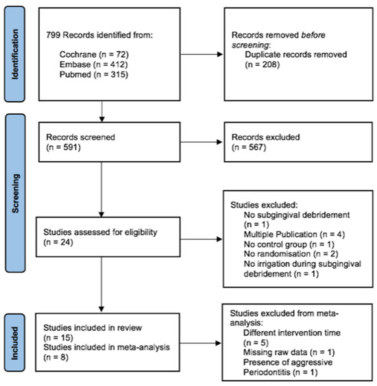 Initially, 799 records were identified from three different databases (see Figure 1). Duplicates were eliminated and titles and abstracts were screened with a reviewers’ accordance of a Cohen’s kappa of 88.7%. In a second step, the full texts of 24 studies were assessed for eligibility. The reasons for exclusion were no subgingival debridement (n = 1), only the existence of a conference paper (n = 4), missing control group (n = 1), no randomization (n = 2) and no irrigation during subgingival debridement (n = 1). During the full-text screening the reviewers’ accordance was 100% (24/24). Finally, 15 studies were included in the review, eight of which were included in meta-analyses. Five studies could not be included due to a very short a follow-up period (5 weeks to 3 months) [32,38,43,44,45], while in one study the mean values/standard deviations of the relevant parameters were not reported. Unfortunately, it was not possible to contact the authors to obtain this data [42]. In addition, one study could not be included in the meta-analysis because it was the only one that included patients with aggressive periodontitis [36].