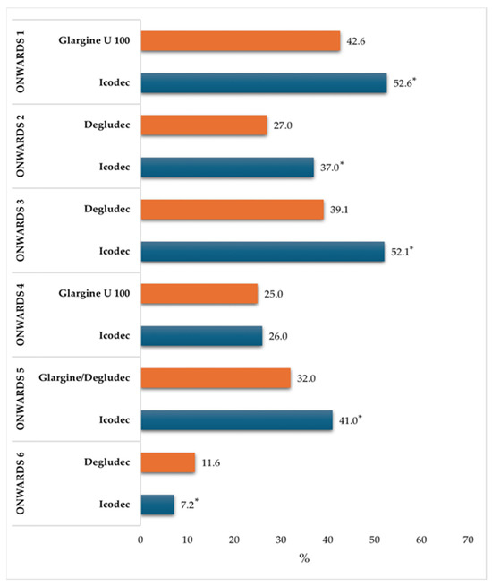 ONWARDS 2 (NCT04770532) was a randomized, open-label, treat-to-target, 26-week trial including 526 T2DM patients previously treated with basal insulin, with or without non-insulin anti-diabetic treatment (except SUs or glinides), who switched to once-weekly insulin icodec versus those who switched to once-daily insulin degludec. The mean reduction in the glycated hemoglobin level at 26 weeks was greater with icodec (8.17% to 7.20%; mean change: −0.93%) than with degludec (8.10% to 7.42%; mean change: −0.71%); the ETD (−0.22%; 95% CI: −0.37 to −0.08) confirmed the non-inferiority (p < 0.001) and superiority (p = 0.0028) of icodec compared to degludec. In the last 5 weeks (i.e., week 22–26) of the trial, participants receiving icodec were longer in the target glycemic range (70–180 mg/dL) than those receiving degludec (63.1% vs. 59.5%; ETD = 2.41%; 95% CI: −0.84 to 5.65; p = 0.15). Rates of combined level 2 or 3 hypoglycemia were 0.73 events per PYE with icodec and 0.27 events per PYE with degludec at week 26 (estimated rate ratio = 1.93; 95% CI: 0.93 to 4.02). The rate of patients that achieved an HbA1c <7.0% without developing clinically significant or severe hypoglycemia events at week 26 were significantly higher in patients receiving insulin icodec rather than the control (37% vs. 27%; estimated odds ratio = 1.59; 95%CI: 1.07 to 2.36). No new safety issues were identified between the two groups in the trial [36].