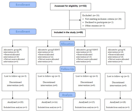 (1) The IPC group (n = 20), in which patients were treated with intermittent pneumatic compression therapy; (2) the R-ESWT group (n = 16), in which patients were treated with radial extracorporeal shockwave therapy; (3) the F-ESWT group (n = 15), in which patients were treated with focal extracorporeal shockwave therapy; (4) the SC group (n = 18), in which patients were treated with standard care only.