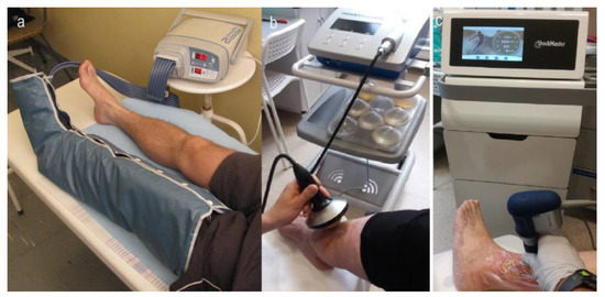 The procedure of therapy with the use of (a) intermittent pneumatic compression, (b) focused extracorporeal shockwave therapy, and (c) radial extracorporeal shockwave therapy.