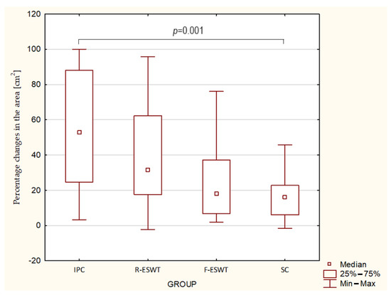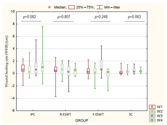 In addition to assessing the percentage change in the wound surface area, our study evaluated the WHR through weekly assessments. This approach was used due to the fact that the healing rate of wounds of different sizes is not the same [18,19,22]. The mean WHR coefficient was 9.6 mm in the IPC group, 6.1 mm in the R-ESWT group, 4.3 mm in the F-ESWT group, and 3.1 mm in the SC group per week.
