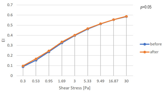 Our results indicate that there were no statistically significant changes in the values of RBC deformability at each of the investigated shear rates. Specifically, the EI value did not differ significantly between the beginning of therapy and its end at each of the wall pressures tested (p > 0.05) (Figure 5).