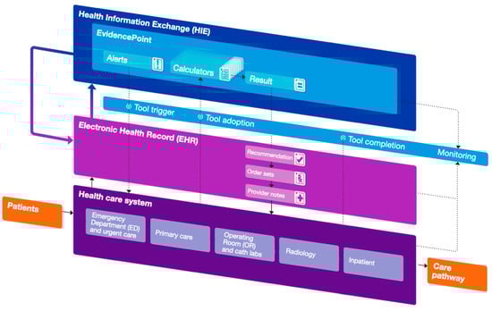 The updated 2024 International Union of Angiology Consensus Guidelines on VTE prevention and management for the first time recommended the use of health informatics technology in the form of electronic alerts or CDS tools to identify key populations of medical inpatients that may benefit from inpatient and extended post-discharge pharmacologic thromboprophylaxis []. Antithrombotic guideline recommendations would thus encourage health system-wide adoption and implementation of validated CDS tools, and a recent National Institute of Health (NIH) R01 funding announcement calls for dissemination and implementation of validated CDS tools across multiple health-care environments (https://public.era.nih.gov, accessed on 22 February 2024). The previously discussed CDS platform—called EvidencePoint—utilized in the IMPROVE-DD trial is EHR-agnostic, thus theoretically interoperable within any EHR, and adaptable, thus able to be modified based on local usability testing to accommodate a variety of clinical workflows and health-care environments [,,] (Figure 1). The platform could sit on top of any informatics infrastructure using internationally standardized SMART on FHIR and health level (HL) 7 applications []. CDS hook protocols can integrate with informatics systems to access information not only within the EHR but also across the health system informatics exchange environment. Single sign-on functionality can eliminate barriers that discourage adoption. Data are not only retrieved but also updated and created with minimal need for bespoke software. Importantly, this cloud-based EHR-agnostic CDS tool built as an online service is able to solve the tension between deep EHR integration and portability by using standardized secure protocols and application programming interfaces to pull and push data irrespective of the underlying informatics environment. The platform is able to retrieve data that auto-populate a specific VTE risk score and assist providers in determining VTE risk at the point of care, as shown in Figure 2 []. Thus, the portability and deep integration of the CDS tool would allow for flexible and seamless workflow integration into clinical care pathways utilizing formal usability testing with rapid iteration over designs, based on standardized metrics and feedback gathered through live testing sessions and interviews with volunteer clinicians. The flexibility of the platform would be in accordance with the “five rights” directive: the right information, to the right person, in the right format, through the right channel, at the right time []. For example, given the need for improved post-discharge thromboprophylaxis in high-VTE-risk patients, adding a discharge trigger point would require minimal effort.