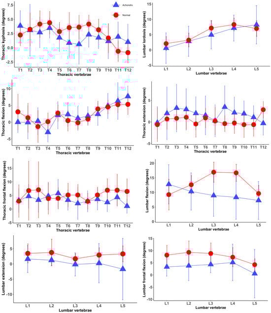 A total of 13 children with achondroplasia and 13 healthy children participated in the study. Participants’ characteristics are provided in Table 1. No differences in the mean age, BMI, sex ratio, and spinal length were observed between healthy children and children with achondroplasia, whereas the mean weight and height were higher in healthy children. Segmental posture and movements of the spine among healthy children compared to those with achondroplasia are displayed in Figure 1. Differences between the two groups were commonly noticed in the segmental movements of thoracic and lumbar vertebrae. For example, healthy children demonstrated greater segmental movements in lumbar vertebrae but less thoracic extension compared to those with achondroplasia.