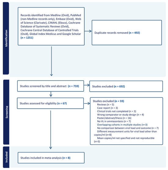 A total of 1251 citations were identified from our search, 492 of which were duplicates. The remaining 759 were screened for title and abstract, of which 692 did not meet inclusion criteria and were therefore excluded. Sixty-seven studies underwent full text review for assessment of eligibility and 59 of these were excluded for various reasons, as listed in Figure 1. Eight studies fulfilled inclusion criteria and were included in our meta-analysis [11,12,17,19,20,21,22,23]. These studies were published between 2009 and 2023 and originated from Europe (six from Italy, one from France, and one from Belgium) and Asia (one from Israel). Pooled together these studies included a total of 443 fetuses with congenital CMV in pregnancy. Five studies reported on fetal outcomes [11,12,19,20,21], with a total of 272 fetuses. Three studies reported on postnatal outcomes [12,17,23], with a total of 126 neonates. Only one study reported on both fetal and neonatal outcomes with 45 individuals [12]. One study [22] did not differentiate between fetal and neonatal outcomes.