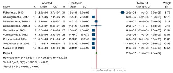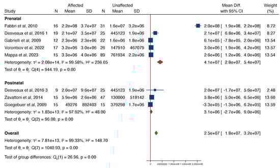 In a subgroup analysis, assessing the association between amniotic fluid VL and fetal and neonatal findings, the VL was significantly higher in the fetuses, with imaging findings related to CMV compared to asymptomatic fetuses with a mean difference of 4.1e+7 (95% CI 2.8e+7–5.4e+7), but the VL was not significantly different between symptomatic neonates compared to asymptomatic neonates with congenital CMV (Figure 4 and Figure 5).
