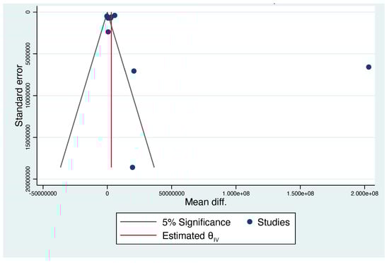 Of all pregnancies with congenital CMV, those affected had a significantly higher VL in the amniotic fluid compared to those unaffected, with a mean difference of 2.2e+7 (range 1.5e+7 to 2.8e+7, Figure 2). The funnel plot showed evidence of publication bias (Figure 3). Egger’s test suggested that smaller studies did not tend to show different results if compared with larger studies, as the CI of the intercept included the value zero with a p-value of 0.099.
