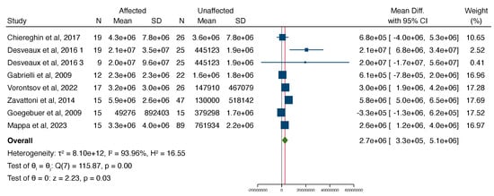 The study by Fabri et al. was detected as an outlier and therefore a “leave-one-out” analysis was performed. The results of the meta-analysis did not change significantly, with an overall mean difference in the viral load being 2.7e+6 (95% CI 3.3e+5 to 5.1e+6), with a significantly higher load in affected cases than unaffected cases.