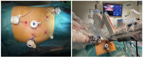 Trocar configuration in RAPN using the Hugo™ RAS System was recently described in a three-arms setting [14,22], which involved an initial 11 mm robotic camera trocar along the pararectal line, positioned approximately 14 ± 2 cm away from the umbilicus. Two additional 8 mm operative robotic ports were placed under direct vision caudal to the endoscope trocar, which ensured appropriate distances from the optical port. Two 12 mm laparoscopic ports for the bed assistant were carefully situated between the robotic ports, maintaining a minimum separation distance of 8 cm. A safety margin of 2 cm from all bony prominences was observed (Figure 1). A standard intra-abdominal pressure of 12 mmHg was achieved through pneumoperitoneum induction.