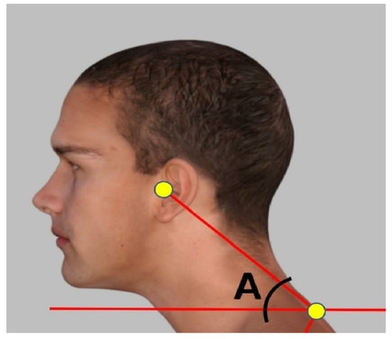 The craniovertebral angle (CVA). Adhesive marker placement locations at the C7 spinous process and the tragus of the ear. A line is constructed between the two markers, and then a horizontal line is drawn through the C7 marker; angle A is the CVA. This method has excellent examiner reliability [16,17].