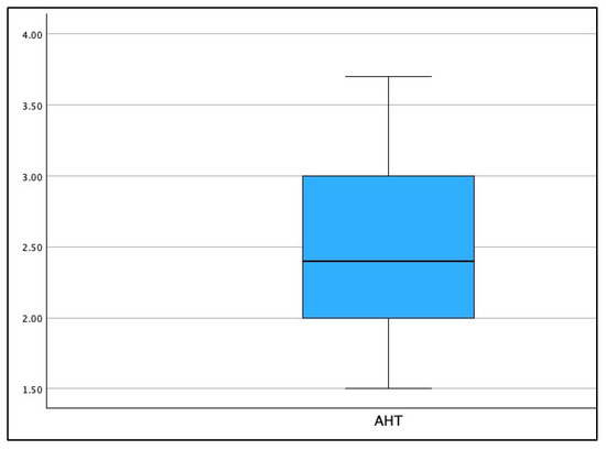 Boxplot of the distribution for radiographically measured anterior head translation (AHT) C2–C7 (cm) in the population of 120 patients.