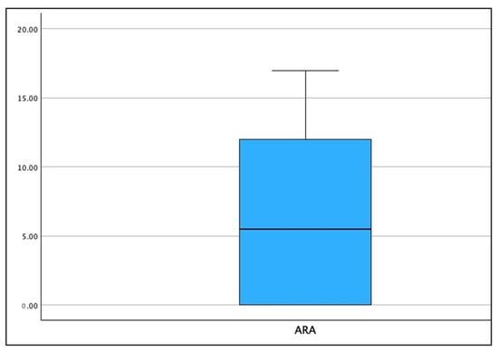 Boxplot of the distribution for radiographically measured cervical lordosis absolute rotation angle (ARA) C2–C7 (°) in the population of 120 patients. The absolute value is presented where lordosis is a positive number in this plot. Note, there is no lower ‘whisker’, as the inclusion criteria included lordosis values between 0 and 20°.