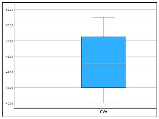 Boxplot of the distribution for the forward head posture as measured with the craniovertebral angle CVA (°) in the population of 120 patients.