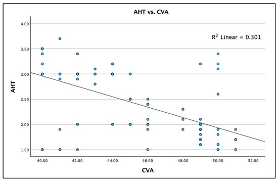 Linear regression correlation between the craniocervical angle (CVA) and the anterior head translation (AHT) C2–C7 sagittal vertical axis (SVA) in 120 participants with chronic myofascial pain. Linear regression results: (1) equation is: y = 7.08 − 0.1x (2) Spearman’s r = −0.549; (3) R2 = 0.301, p < 0.001.