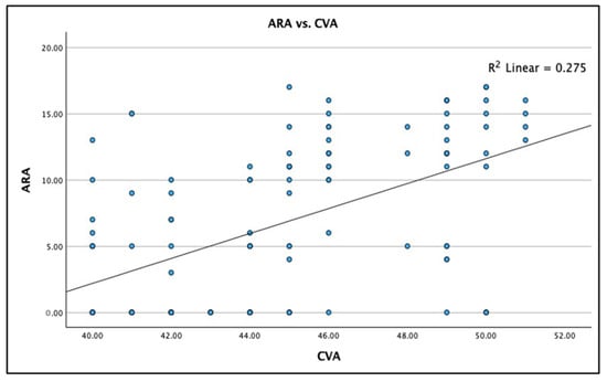 Linear regression correlation between the craniocervical angle (CVA) and the absolute rotation angle (ARA) C2–C7 in 120 participants with chronic myofascial pain. Linear regression results: (1) equation is CVA to predict ARA: y = −35.48 + 0.94x (2) Spearman’s r = 0.524; and (3) R2 = 0.275, p < 0.001.