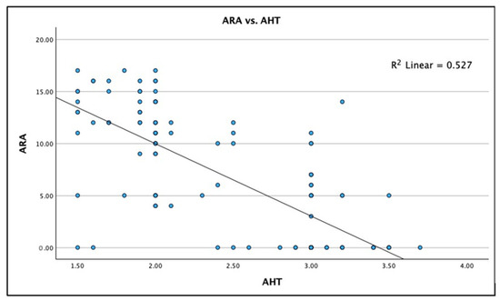 Linear regression correlation between the anterior head translation (AHT) C2–C7 sagittal vertical axis (SVA) and the absolute rotation angle (ARA) C2–C7 in 120 participants with chronic myofascial pain. Linear regression results: (1) equation is AHT to predict ARA: y = 23.87 − 6.95x (2) Spearman’s r = −0.726; and (3) R2 = 0.527, p < 0.001.
