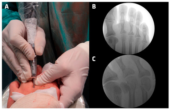 All patients are operated on utilizing an outpatient basis, under local anesthesia using an anesthetic ankle block with mepivacaine 20 mg/mL, with a maximum of 10–12 mL in the ankle block and 4–6 mL in the intermetatarsal block.