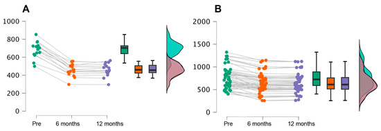 Post hoc analysis using Bonferroni correction revealed that plantar pressure decreased significantly as time passed between measurements at 6 months and 12 months (mean difference = 145.77, p < 0.001) and between 6 months and 12 months (mean difference = 144.80 units, p = 0.001). No significant differences were found between 6 months and 12 months. Observing the effect size in the post hoc contrast, we highlight a Cohen’s D of 7.51 in the pre-6 months pair and 0.33 in the pre-12 months pair. If we compare these plantar pressures by dividing the two groups of the study into those who used a goniometer and those who did not, we observe the following data.