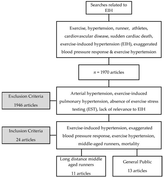 A total of 1970 articles related to EIH were identified using search terms. Out of these, 1946 studies were excluded for reasons such as arterial hypertension, exercise-induced pulmonary hypertension, the absence of exercise stress testing (EST), and a lack of relevance to EIH. Our research indicated that 11 quasi-experimentally designed studies were conducted in randomized controlled trials (RCTs) on long-distance runners with EIH, as presented in Table 1. Furthermore, Table 2 includes 12 cohort studies and 1 quasi-experimental design for use on the general public. In total, we discussed and analyzed 24 studies related to this topic (Figure 1).