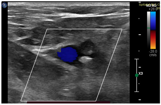 B-mode vascular echo image—long axis: right superficial femoral artery with occlusive tumoral fragment.