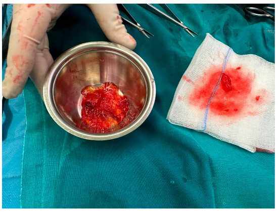 In settings of bilateral acute lower limb ischemia confirmed by Doppler ultrasounds associated with a very friable gigantic left ventricle tumor, the embolic mechanism was the most likely. With over 8 hours since the onset of symptoms, we assumed that she presented with prolonged limb ischemia, which was endangering her functional abilities. So, bilateral embolectomy with Fogarty catheter and the removal of tumoral arterial obstructive fragments was performed on an emergency basis. Considering the high embolic risk of this hypermobile, fragile, cardiac tumor (and being especially concerned about the risk of stroke), an indication for tumor excision was established. So, after the embolectomy procedure, in the same surgical session, under cardio-pulmonary bypass, a giant, translucent, jelly-like consistency, left ventricular tumor was excised and sent for histopathological examination (Figure 5). The histopathological and immunohistochemistry reports were consistent with the diagnosis of an intracardiac myxoma.
