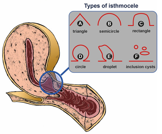 The picture shows a drawing of a longitudinal section of Uterus, Cervix and Vagina. In the blue circle in correspondence to the uterine isthmus, there is an enlargement (a sack or pouch) of the uterine cavity: isthmocele. On the top right of the image, there is a schematic representation of the possible different shapes of isthmocele: (A) triangle shape; (B) semicircle shape; (C) rectangle shape; (D) circle shape; (E) droplet shape; (F) inclusion cysts.