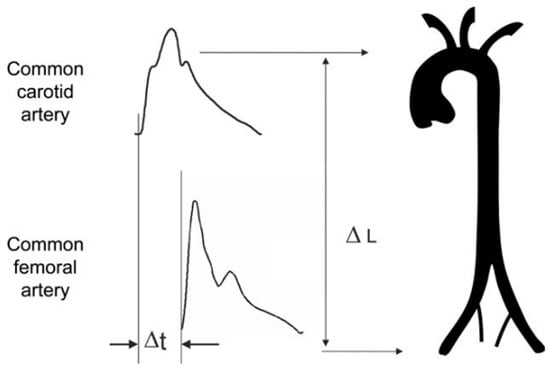 Carotid–femoral pulse wave velocity measurement using the foot-to-foot method. ΔL: distance; Δt: transit time [].