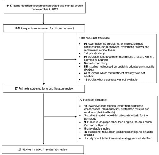 Rosso, C.; Urbanelli, A.; Spoldi, C.; Felisati, G.; Pecorari, G.; Pipolo, C.; Nava, N.; Saibene, A.M. Pediatric Odontogenic Sinusitis: A Systematic Review. J. Clin. Med. 2024, 13, 2215. https://doi.org/10.3390/jcm13082215