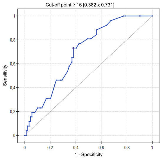 Based on the ROC curve, the number of B-lines in the LUS ≥ 16 was determined with a sensitivity of—73% and specificity of—62%, indicating exacerbation of heart failure symptoms on admission (AUC = 0.70; 95% CI = 0.59–0.79; p = 0.0023) (Figure 1).