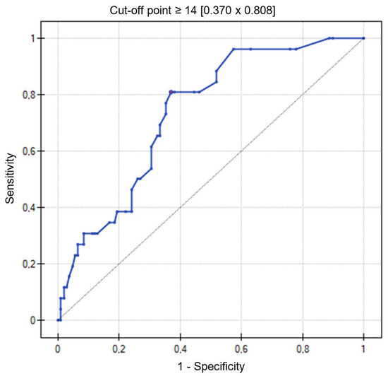 In the study group of patients, the number of B-lines on lung ultrasound ≥14 was determined as a cut-off point (AUC = 0.73, 95% CI = 0.64–0.83, p = 0.0002; sensitivity 81%, specificity 63%) indicating an increased risk of death during the follow-up period (Figure 2).