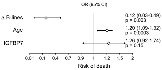 Multivariate analysis was performed by stepwise regression in the entire study population, including the following parameters: number of B-lines and ∆ B-lines, age, LV ejection fraction, creatinine concentration, GFR, NTproBNP, IGFBP7, hemoglobin concentration, and total cholesterol and LDL-cholesterol fraction, which showed the following: