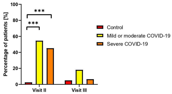 Reported gynecological disorders among control, mild or moderate COVID-19, and severe COVID-19 groups during second and third visits. *** p ≤ 0.001 vs. control group.