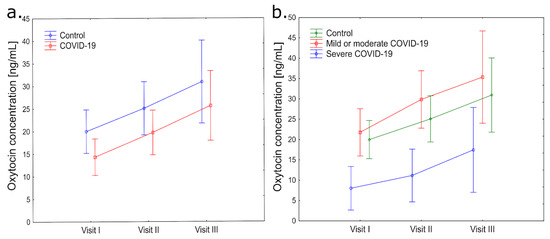 (a) Changes in oxytocin concentration levels in the blood plasma of healthy patients and patients after COVID-19 infection during three subsequent visits (first visit, second visit, and third visit); (b) changes in oxytocin concentration levels in control, mild or moderate COVID-19, and severe COVID-19 groups were measured at three-time points (first visit, second visit, and third visit).