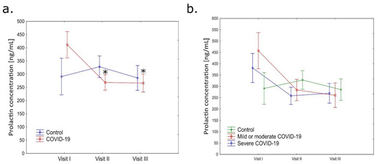 (a) Changes in prolactin concentration level in the blood plasma of healthy patients and patients after COVID-19 infection during three subsequent visits (first visit, second visit, and third visit); (b) changes in prolactin concentration levels in control, mild or moderate COVID-19, and severe COVID-19 groups were measured at three time points (first visit, second visit, and third visit). * p ≤ 0.05 vs. first visit in COVID-19 group.