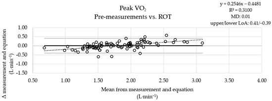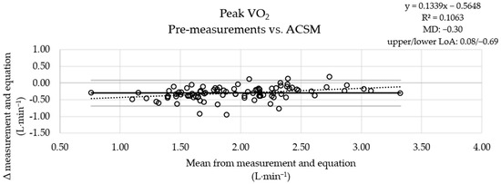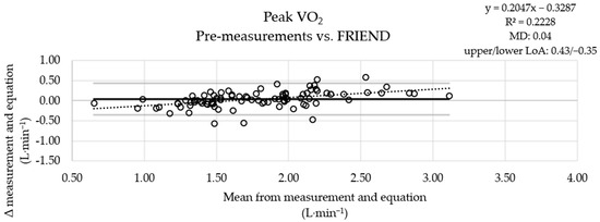 The MD between the measured pre-values and the results of the ROT combination was small (Figure 1), the MD obtained using the ACSM equation was more pronounced (Figure 2), and the results obtained with the FRIEND equation (Figure 3) were similar to those obtained using the ROT combination. An analysis of the measured post-values and the results obtained with the equations showed a similar pattern (Figures S1–S3).