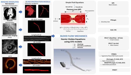 Coronary artery disease (CAD) is the main cause of morbidity and mortality around the world [1]. Coronary revascularization by percutaneous coronary intervention (PCI) restores the epicardial flow and aims at relieving angina and myocardial ischemia. Recent studies have revealed that in patients with chronic coronary artery disease, the option of whether to perform PCI in moderate lesions is difficult, as both visual assessment and quantitative coronary analysis (QCA) have revealed low correlation with the functional stenosis severity [2,3]. Therefore, the need to evaluate both the functional and anatomical severity of obstructive CAD, especially when intermediate stenosis is present, has prompted the adoption of invasive functional indices, principally the fractional flow reserve. The FFR has enabled interventional specialists to precisely decide which lesions are functionally significant and thus may lead to ischemia and future adverse events [4,5]. The clinical importance of the FFR assessment measured by an intracoronary pressure wire has been acknowledged in the international guidelines and long-term data have shown improved outcomes with FFR-guided decision-making. During the last decade, the use of the FFR has slowly increased from 14.8% to 18.5% in patients with angiographically intermediate stenosis [6]. However, its use differs widely across the catheterization laboratories globally. This distinction may be related to the invasive nature of FFR evaluation, the prolongation of the cardiac catheterization, the use of hyperemic agents and the high equipment and pharmacologic costs [7]. To overcome these limitations, new methodologies for assessing physiological indices based on fluid mechanics principles have been advanced to reduce the interventional feature of the FFR methodology estimation. The progress of technology has also allowed the wide-ranging application of computational fluid dynamics techniques to coronary imaging, thereby enabling the accurate estimation of the severe occlusions of coronary arterial lesions [8]. During the last decade, these techniques have been applied to both non-invasive (i.e., coronary computed tomography angiography [CCTA]) and invasive (angiography or intravascular imaging in the catheterization laboratory) coronary imaging datasets. All these methods make various assumptions for computing the equivalent FFR values and demonstrate high diagnostic performance and discriminatory power. The current review summarizes the computational models based on invasive and non-invasive imaging, the application of virtual indices in clinical studies and their performance against the gold standard FFR, and it discusses the future steps and opportunities for incorporating virtual functional assessment into the management strategy of high cardiovascular risk patients.