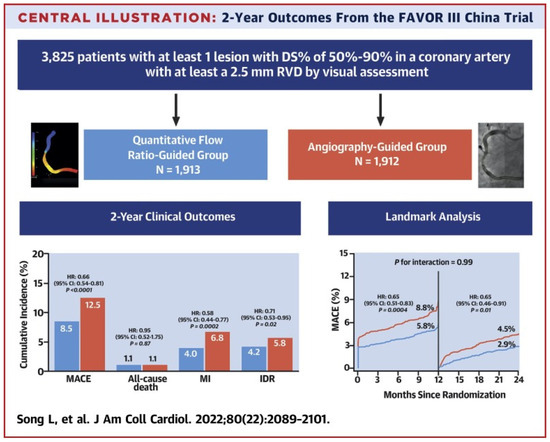 - Song, L.; Xu, B.; Tu, S.; Guan, C.; Jin, Z.; Yu, B.; Fu, G.; Zhou, Y.; Wang, J.A.; Chen, Y.; et al. 2-Year Outcomes of Angiographic Quantitative Flow Ratio-Guided Coronary Interventions. J. Am. Coll. Cardiol. 2022, 80, 2089–2101. [Google Scholar] [CrossRef] [PubMed]