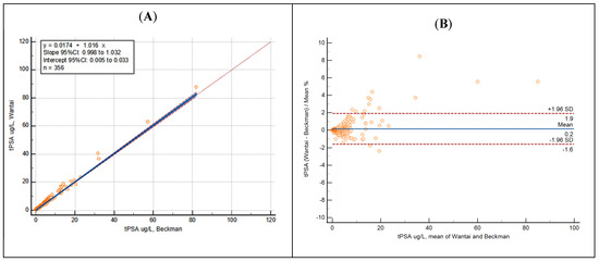 Passing–Bablok regression (A) and Bland–Altman analysis (B) of t-PSA showing results obtained using Beckman (AOPD) and Wantai Wan200+ equipment.