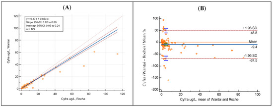 Passing–Bablok regression (A) and Bland–Altman analysis (B) of Cyfra 21-1 showing results obtained with Roche (AOPD) and Wantai Wan200+ equipment.