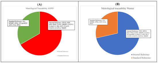The traceability methods for both Wantai and comparative assays for each analyte (Figure 3 shows the percentage of assays with a declared metrological traceability (panel A for comparator methods, AOPD; panel B for Wantai system)). Metrological traceability data were obtained by manufacturers’ inserts.