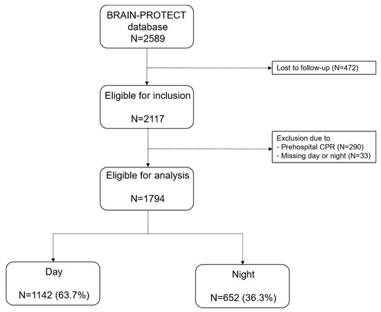 - Schriefl, C.; Mayr, F.B.; Poppe, M.; Zajicek, A.; Nurnberger, A.; Clodi, C.; Herkner, H.; Sulzgruber, P.; Lobmeyr, E.; Schober, A.; et al. Time of out-of-hospital cardiac arrest is not associated with outcome in a metropolitan area: A multicenter cohort study. Resuscitation 2019, 142, 61–68. [Google Scholar] [CrossRef]