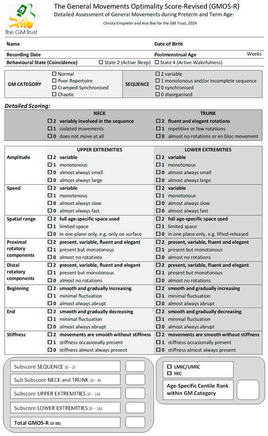 The GMOS-R as included in Figure 1 is freely available, and can be found in the Supplementary Materials as Figure S1. Anyone trained in GMA [] can apply the detailed assessment process and utilize the GMOS-R; in addition, advanced training courses provided by the Prechtl General Movement Trust also focus on GMOS-R.