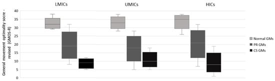 In the case of PR GMs, infants from LMICs and UMICs had lower GMOS-R medians than infants from HICs. If the GMs were scored as CS, the infants of LMICs and UMICs had a higher GMOS-R median than infants from HICs (Table 2). The GMOS-R median of infants whose GMs were scored as chaotic did not differ (Table 2).