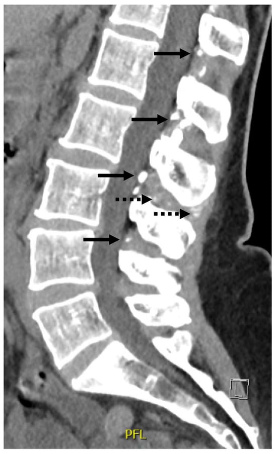 Lumbar CT scan. The lumbar CT scan, performed three months before the consultation, demonstrated diffuse degenerative disc disease with atypical heterotopic calcifications of the yellow ligament (arrows) and interspinous ligaments (dotted arrows).