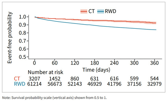 Survival analysis showed that patients in the RWD cohort had a higher risk of major bleeding during the 12 months post-DOAC treatment compared to the CT cohort (Figure 3).