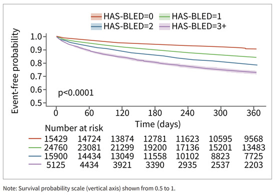 Major bleed risk 12-month follow-up for patients in RWD, stratified via HAS-BLED Score.