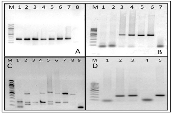 Representative images of PCR products from the conventional PCRs used in the study: (M) Molecular weight marker (100 bp) (A) PCR of the Beta-globin (268 bp) gene used as an internal control; (B) PCR of Candida albicans (496 bp), where lanes 1 and 2 are negative samples, lanes 3, 4, and 5 are positive samples, lane 6 is positive control, and lane 7 is blank control; (C) multiplex PCR for Gardnerella vaginalis (206 bp), Atopobium vaginae (558 bp) and Megasphaera phylotype 1 (144 bp), where lanes 1 and 2 are positive controls, lanes 3, 4, 5, 6, 7, and 8 are positive samples, and lane 9 is blank control; and (D) Chlamydia trachomatis PCR (241 bp), where lane 1 is negative sample, lanes 2 and 3 are positive samples, lane 4 is blank control, and lane 5 is positive control.