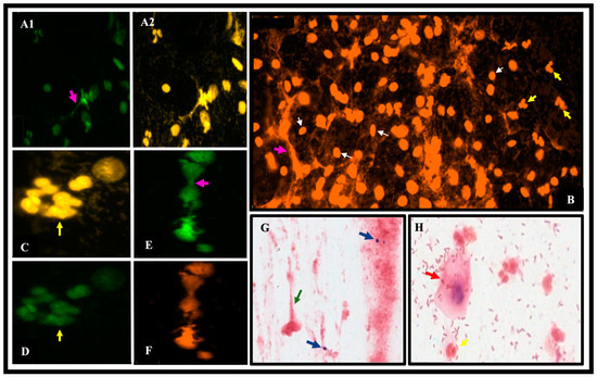 Representative images of vaginal discharge smears from women with PCOS. The TissueFAXS i Plus cytometry microscope was used to scan the smears at 20X magnification and TissueFaxs-Viewer software was used to obtain images at 100-450% zoom. Green staining in (A1,D,E) shows anti-NE labeling (Alexa fluor 488); Sytox orange staining marks DNA in images (B,F); Gram staining (G) shows structures suggestive of NET (green arrow), and presence of blastoconidia corresponding to Candida albicans diagnosed by PCR (blue arrows); Gram-stained image (H) indicates vaginal squamous cell (red arrow) showing different bacterial morphotypes corresponding to an intermediate microbiota; image (F) marks PMNs in the process of DNA release; yellow arrows indicate PMN nuclei (B,C,D,H); white arrows indicate squamous epithelial cell nuclei (B) and fuchsia arrows indicate NETs (A1,E) and (A2,B) channel merging. Images (C,D,E,F) (450% zoom), (A1,A2,G,H) (230% zoom), and (B) (100% zoom) were used.